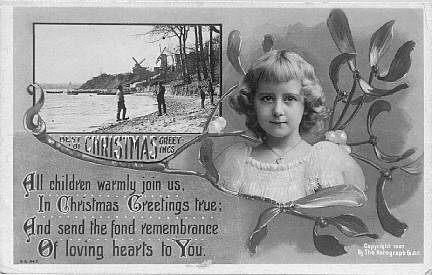 | For a long time I had only descriptions of this type. Recently I have acquired two on ebay, shown below. As Faulkner indicated, these are glossy real photos, processed on bromide paper. Though greetings, they also carry insets with typical views. From the few examples on hand, we may surmise that 'X' signifies a Christmas greeting. Faulkner describes these as sepia, which would account for the 'S,' though 447 is clearly black & white. Both the portrait and the view are excellent photographic art. |