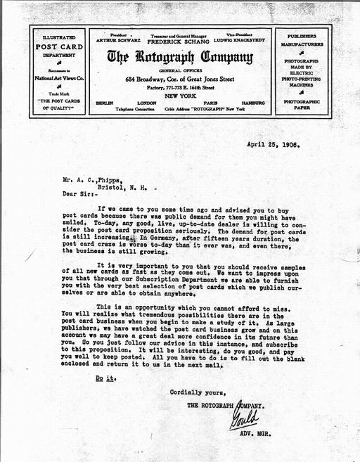 | All the books tell of the craze in sending and collecting postcards which gives us our secondary part in the hobby today. More cards then, more cards now. This letter from 1906 makes evident the importance of the medium not only as popular entertainment, but as early 20th century business advertisement. Here Mr. Gould encourages a druggist or stationer in New Hampshire to buy views which the company has already published and perhaps to photograph less well-known local scenes. When sold this way, the cards often bore the imprint of such a merchant, with or without the Rotograph logo--see the example on the "Backs" page. Should we consider these early Rack Cards? |